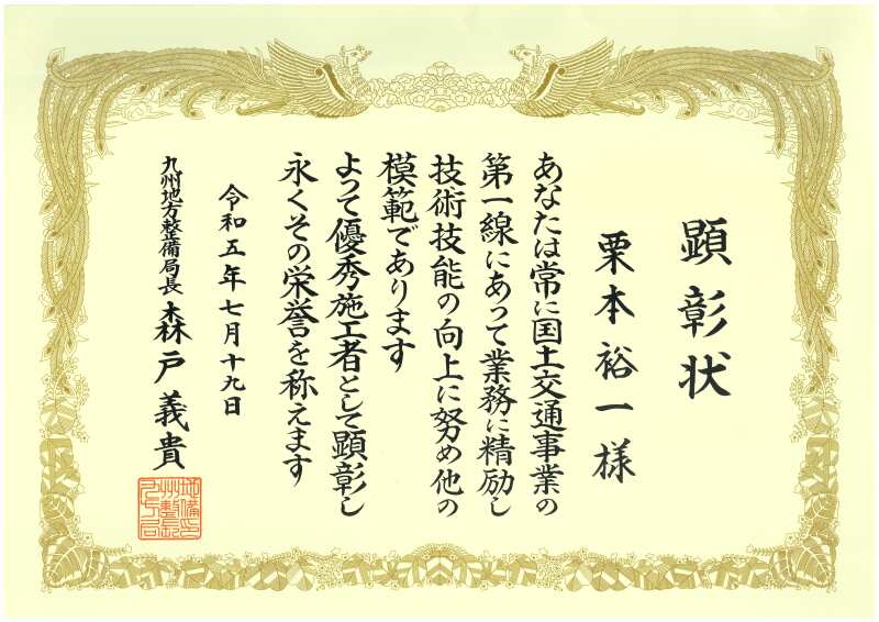 令和5年度 九州地方整備局「国土交通行政功労表彰」の発表があり、当社技能者が「優秀現場従事者」を受賞しました。